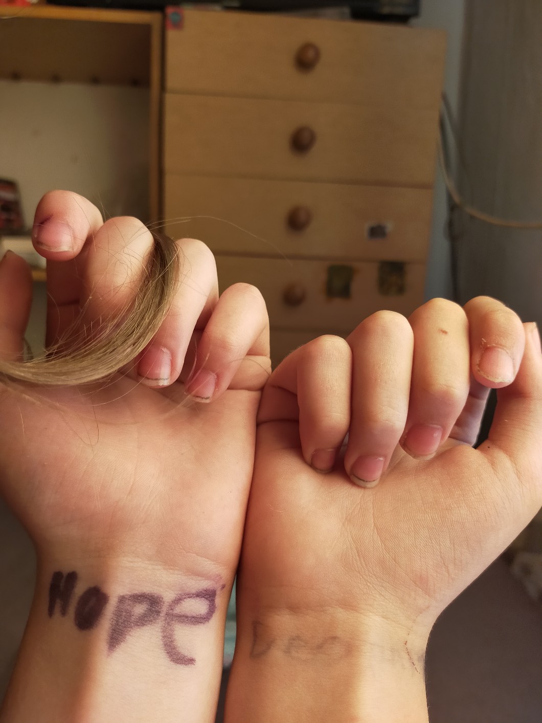 AUTOR•Napisałam dziś mazakiem na jednej ręce „Hope” a na drugiej „despair” i „Hope” zostało a „Despair” się prawie zmyło a ja tego nie myłam xDDDDDDDDDdDDDDDDDDDDFSSFFSCSFDCDFSFSFSFSFSFSDDDDDDDD