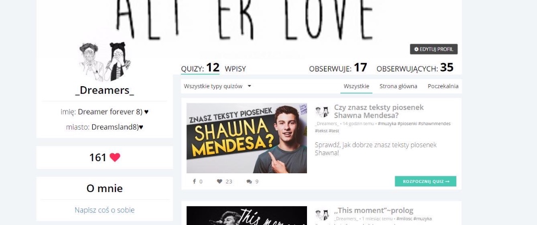 Moja koleżanka raz poleciła mi SQ i robiłam tam quizy. Raz trafiłam na jedno z twoich opowiadań. Jakiś czas później znowu i bardzo spodobał mi się twój styl pisania. Jedno z twoich opowiadań jest najlepszą rzeczą jaką czytałam! Na prawdę pięknie piszesz i twoja twórczość zainspirowała mnie do stworzenia sobie tu konta i tworzenia własnej twórczości. Jesteś na prawdę niesamowita. Życzę wszystkiego dobrego i wspaniałych pomysłów na dalsze pisanie 💜