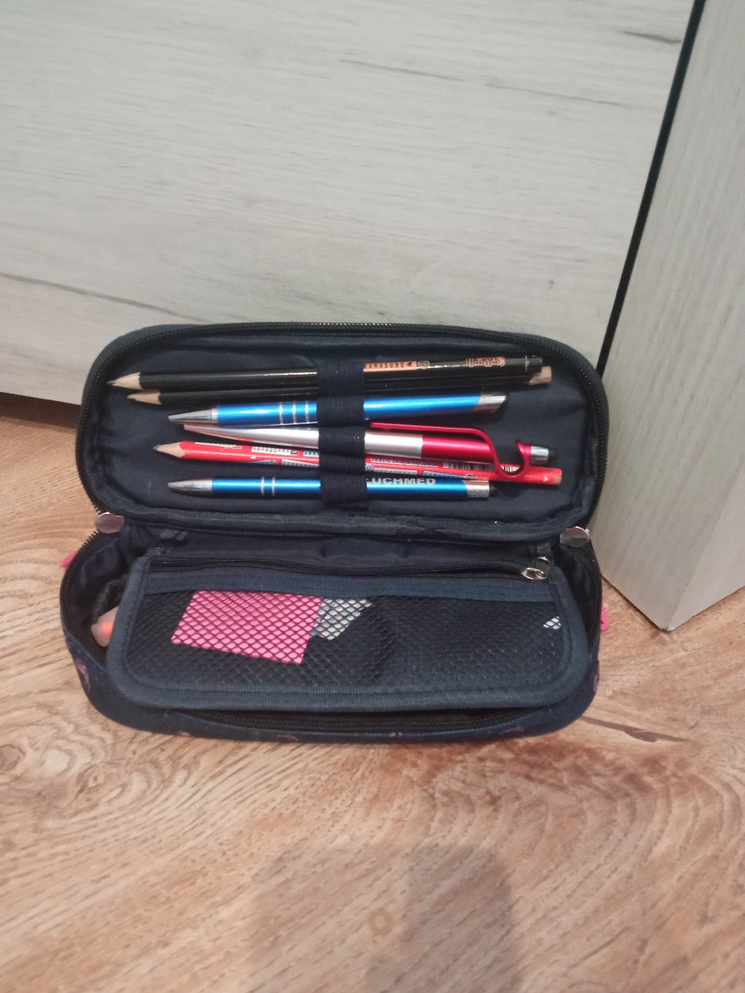 AUTOR•Zajebioszczy piórnik w jednorożce i jakieś pierwsze lepsze długopisy i ołówki z pokoju, oczywiście zakreślacze których nie używam, jakieś karteczki, 4 kredki o podstawowych kolorach, nożyczki i linijka (klej kupię jutro albo będę cyganić od klasy)