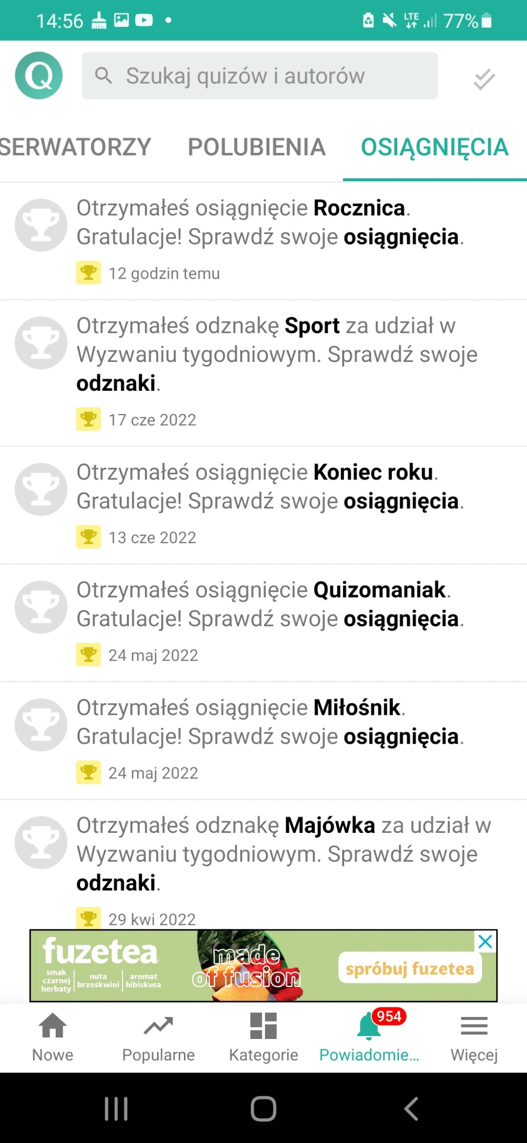 2 miejsce – obserwacje (jeśli jeszcze nie ma), polubienie 7 quizów (jeśli tyle ma)