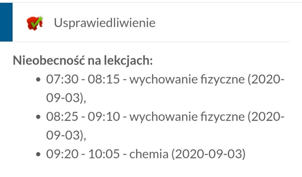 AUTOR•W jakieś dni (nwm jakie) wpisuje mi takie nieobecności od razu usprawiedliwione. Dość, że obniża mi to frekwencję to żaden z moich nauczycieli tego nie widzi. Przy okazji wpisuje mi to czasem z lekcji, których nawet nie mam w danym dniu, np. dzisiaj nie miałam wf-u, a chemię mam o 7:30