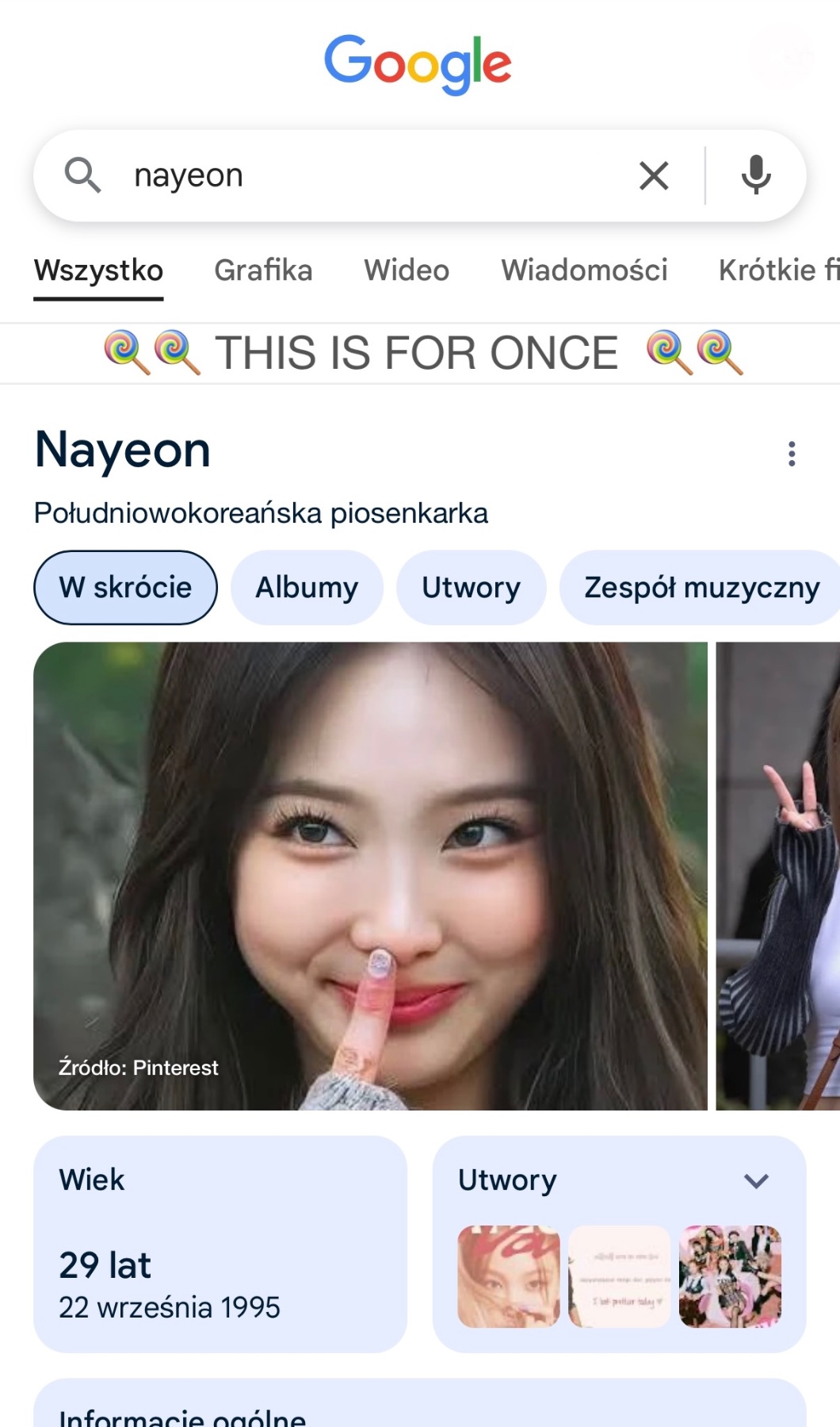 Fun fact: jeśli wpiszecie sobie w wyszukiwarkę Google "Twice" albo którąkolwiek z członkiń tego zespołu, to wyświetli wam się pasek "🍭🍭 THIS IS FOR US 🍭🍭", "🍭🍭 THIS IS FOR ONCE 🍭🍭"