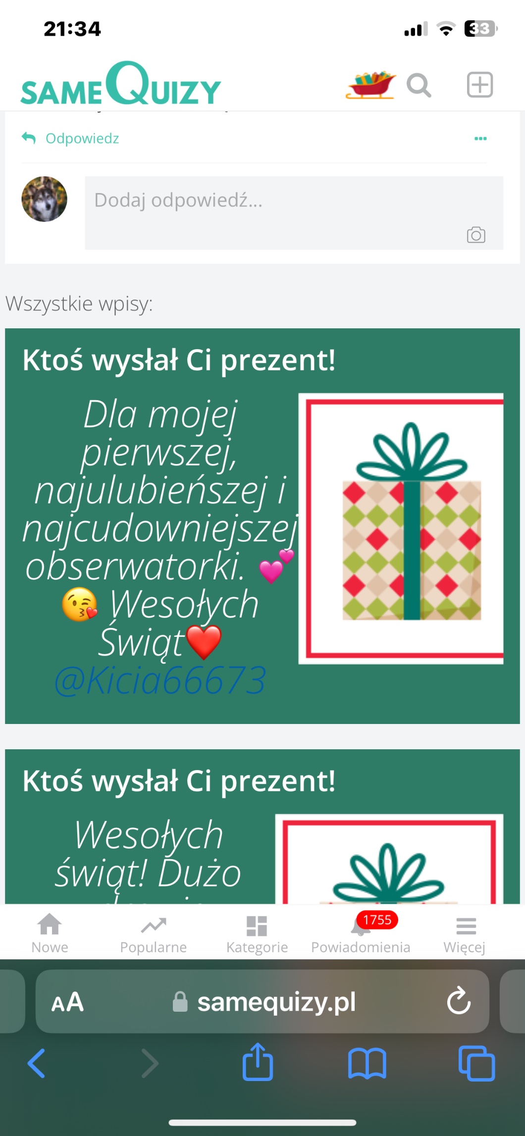 @Alfa535 a btw wejdź na mój profil we wpisy bo tam taka typiara odpowiedziała na to co mi wysłałaś jako prezent wiesz te pieski naj itd