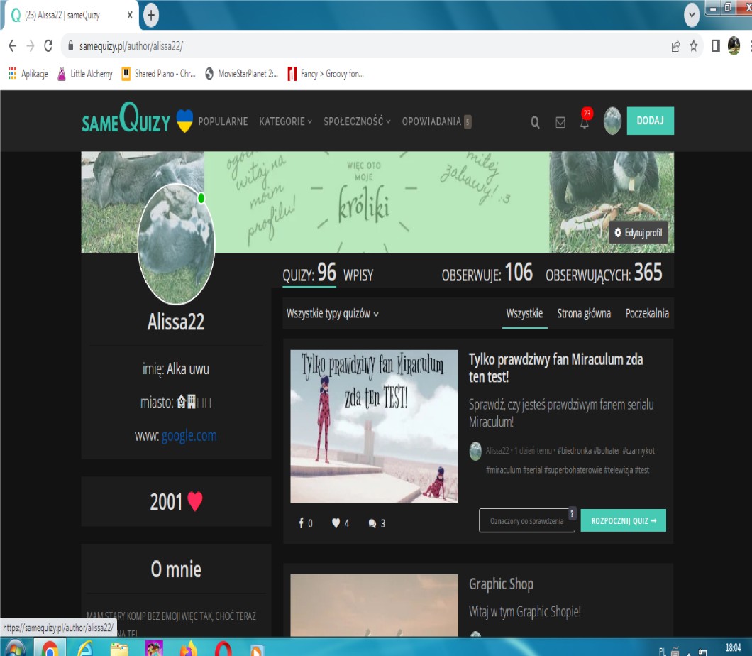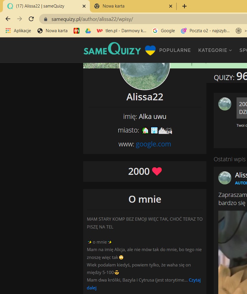 • AUTOR@essix nie, na razie nic, własciwie to nigdy nie zrobili tego sami z siebie… wiedzialam, ze sie staralam, polowa moich quizow jest zrobiona starannie i tego nie bede ukrywac, ludzie mowili „zycze SG” i to tez mnie motywowalo, ale potem, skoro i tak nie mam na co od nich czekac, to po co…? Jeszxze Bazyl prawie ucha nie ma, mozesz zobaczyc, a ja dzis wstalam o 8:00 bo mi sie snilo, ze zaplanowali go, a tu nic…
