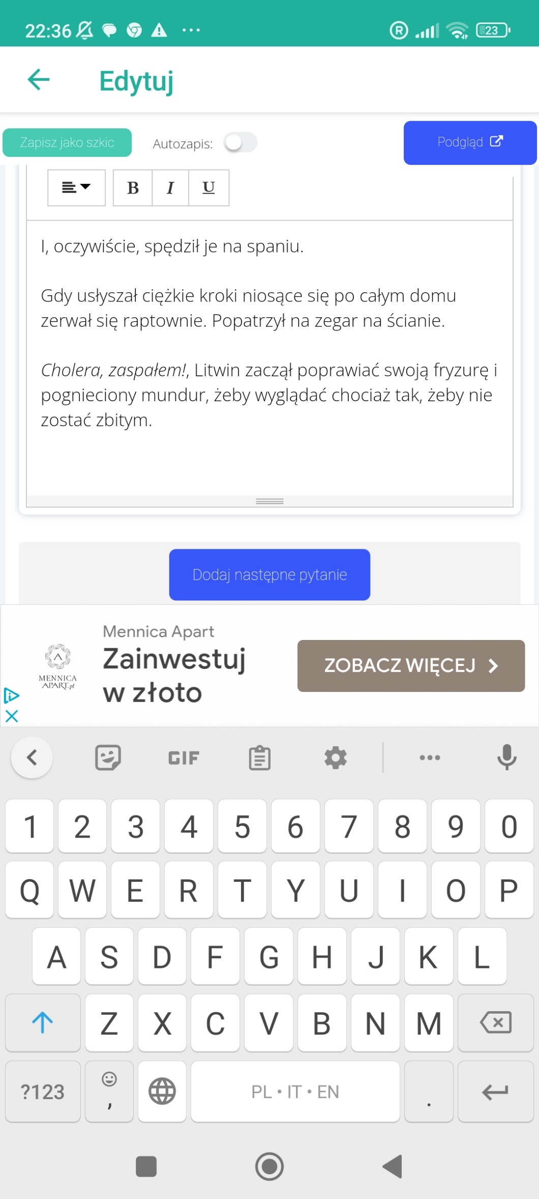 • AUTOR@Herbatnikk @Herbatnikk nie, spokojnie, nie czuję DUŻEJ presji, a mały „kop” przyda mi się do walki z brakiem weny na jakiś akapit