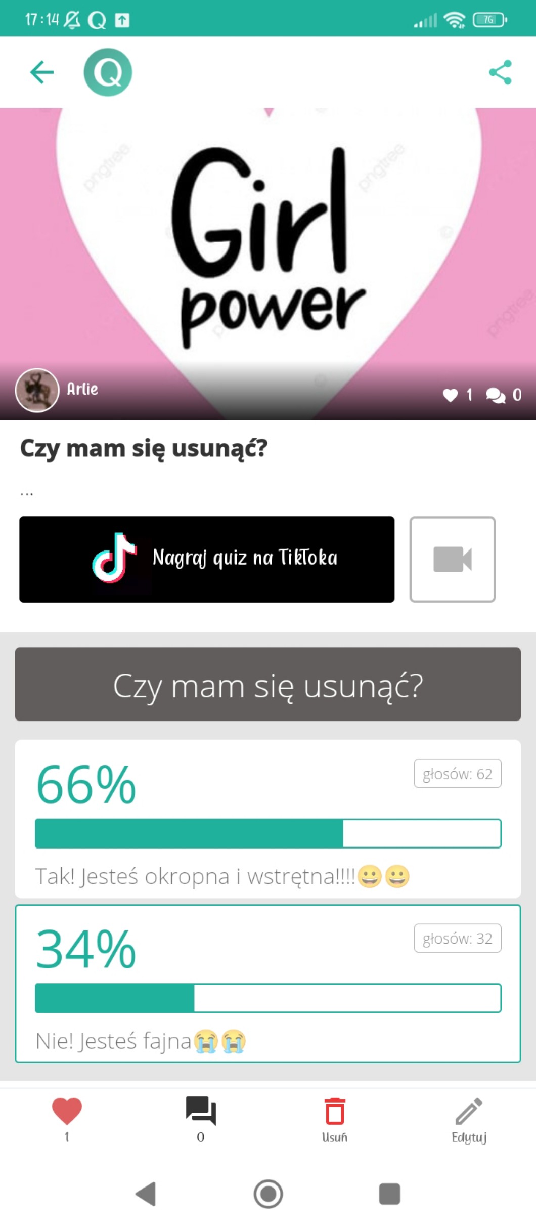 @Arlie nie opłaca ci się! Jak się usuniesz i potem będziesz chciała wrócić może ci się już tak dobrze nie zdobywać obs😭😭😭😭