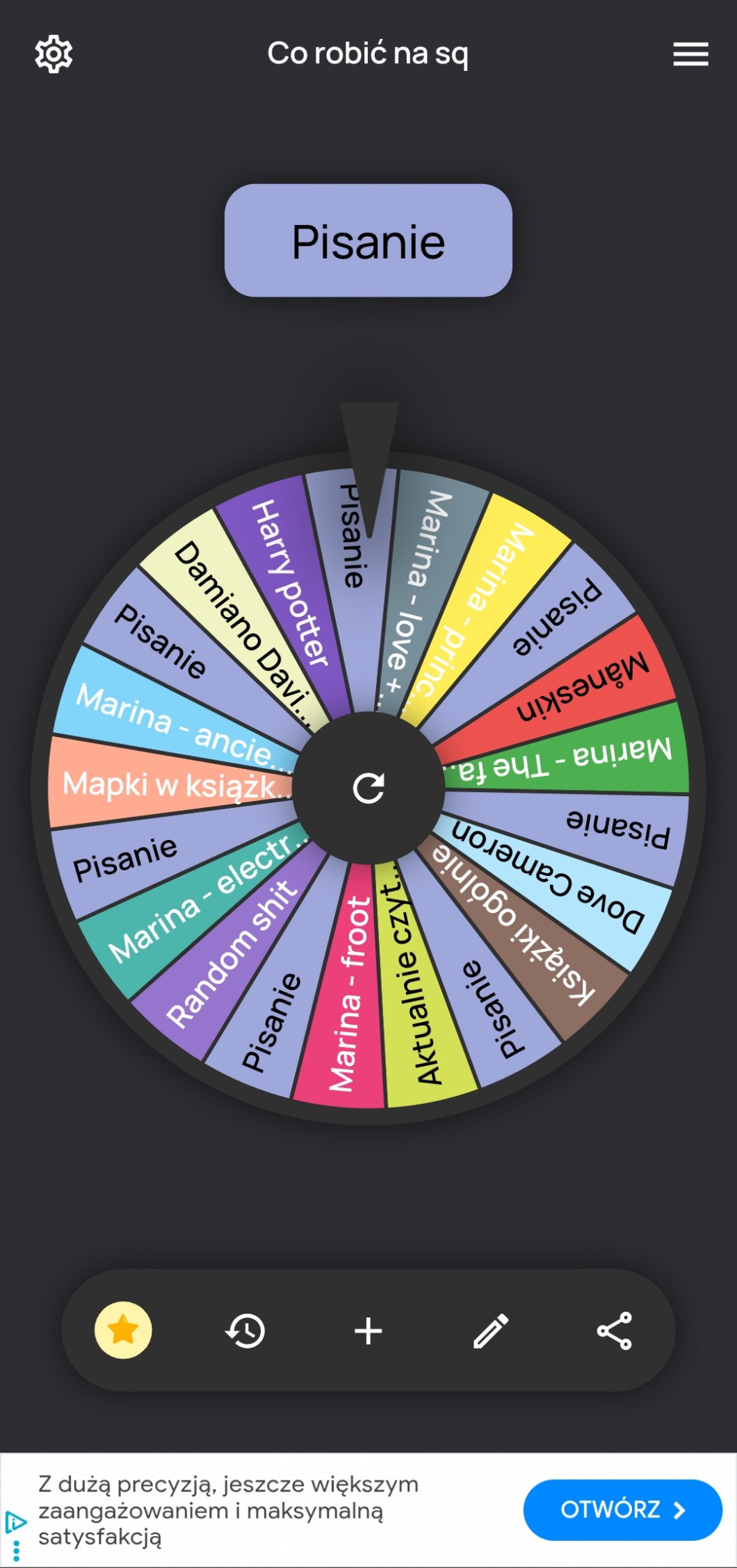 Mam tak: Måneskin, Damiano David, Dove Cameron, osobno wszystkie płyty Mariny, pisanie razy 7, książki ogólnie, książkę czytaną aktualnie, mapki w książkach, Harry Potter i cytując mnie ''random shït'' jakby mi coś randomowo przyszło do głowy coś jeszcze mam dodać? (Przypominam że używam ruletki i może się wylosowac cokolwiek)