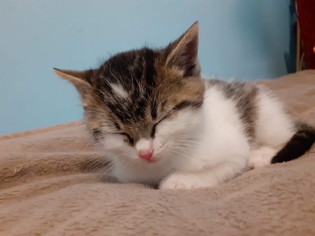 No to najpierw był mega przestraszony, ledwo wyszedł z transportera. Nie dał się do siebie zbliżyć, trząsł się, ogonek chował i tak było może przez godzinkę. Po prostu dotrzymałam mu towarzystwa i obserwowałam, jak poznaje mój pokój. Dobrał się do prześcieradła zwisającego z łóżka, więc zamieniłam prześcieradło na ręcznik, którego mi nie szkoda. 😅 I tak chodził w swoim małym tunelu, bo ręcznik dał taki kształt. Wszystko badał, musiał sobie pogryźć i podrapać. Trochę się napił, ale z jedzeniem był większy problem. Malutka ta karma, a i tak musiałam podzielić ją na trzy części i włożyć mu do buzi (bo chciał zjeść, ale nie wiedział jak), w efekcie czego zostałam ugryziona, ale te ząbki są takie słodkie, że było warto. 😂💛 Po pewnym czasie już oswoił się ze mną, bo chętniej do mnie przychodził, wspinał się na kolana i ocierał, a także wystawiał łapki do góry i drapał i gryzł. 😅 Słyszałam, że wychowanie kota obejmuje oduczenie tych dwóch ostatnich czynności w stosunku do człowieka, więc macie jakieś rady, jak przekierować go na drapanie przedmiotu? Bo jednak małe koty można tego nauczyć, a chciałabym to zrobić, zanim już całkiem się przyzwyczai, że ludzkie dłonie są do gryzienia. W dalszym ciągu zwiedzał pokój (resztę domu pokażę mu potem, bo zbyt wiele wrażeń dla niego jak na jeden dzień). Szedł sobie i nagle zatrzymał się przy ścianie i przestał się poruszać. Po czym zauważyłam, że zasnął, hah. Kwestia kilku sekund, serio. Przeniosłam go do miękkiego posłania i przykryłam małym kocykiem, żeby było mu ciepło. Jest taki uroczy, kiedy śpi. 💜