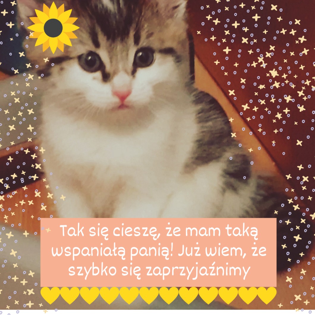 Pewnie już się domyślacie, że całe życie czekałam na kota i nareszcie mogę powiedzieć, że się doczekałam. 💖 Wniosek? Nigdy nie traćcie wiary, bo wszystko jest możliwe. :) Rodzice zawsze byli negatywnie nastawieni do tego pomysłu, jednakże mamę ostatecznie udało się przekonać, a tata został postawiony przed faktem dokonanym, więc już było zbyt późno, aby się wycofać. Postaram się go wychować na posłusznego kota, żeby nie dokuczał domownikom na każdym kroku. Nie pytajcie o imię, ponieważ jeszcze nie mam pomysłu, a nie chciałabym wymyślać na siłę. Poobserwuję trochę, zobaczę jaki ma charakter, żeby nazwać go zgodnie z temperamentem.