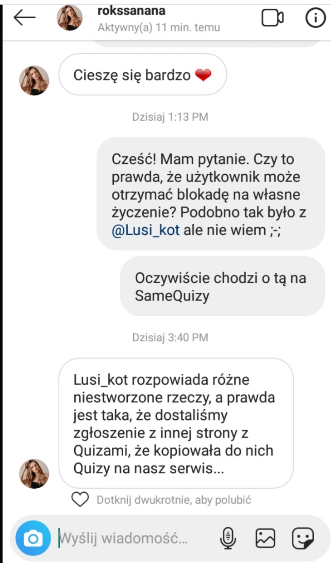 Dzisiaj ranem kontaktowałam się z Patrykiem, są plany, aby w przyszłości powód blokady był jawny, a więc nie ma prawa zgłosić mnie na policję. Nie oczerniałam nikogo, za to ona ma wiele za uszami. Nie wierzcie jej na każde słowo. (Mowa o Lusi_kot)