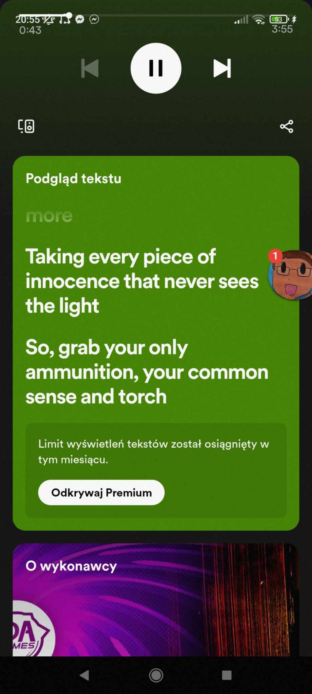 AUTOR•Ej guys czy to prawda że na spotify bez premium jest jakiś limit tekstów bo jakby mi siostra pokazuje i takie wtf to nie wiem czy to każdy czy jak chyab 3 na miesiąc można lol idk