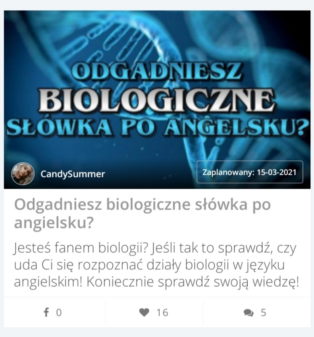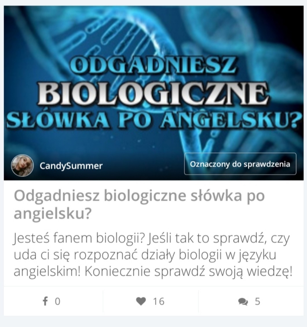 Wpadłam na chwilę powiedzieć Wam, że 🥁 quiz https://samequizy.pl/odgadniesz-biologiczne-slowka-po-angielsku/ został oznaczony do sprawdzenia! Ogromnie wam dziękuję! ❤