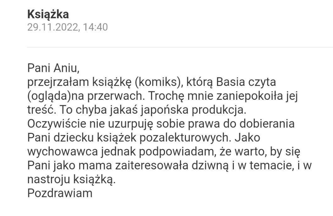 AUTOR•Pamiętacie wpis w którym pisałam o tym jak moja wychowawczyni napisała do mojej mamy o tym że czytam nieodpowiednią książke? Ostatnio mama mi zainstalowała librusa i znalazłam tą wiadomość