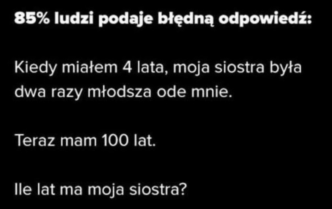 • AUTOR@Luna85219 Jak miał 4 lata to była od niego 2 razy młodsza czyli miała 2 lata. A teraz on ma 100 lat więc ona mq 98 lat. Nigdzie nie ma że teraz jest od niego dwa razy młodsza