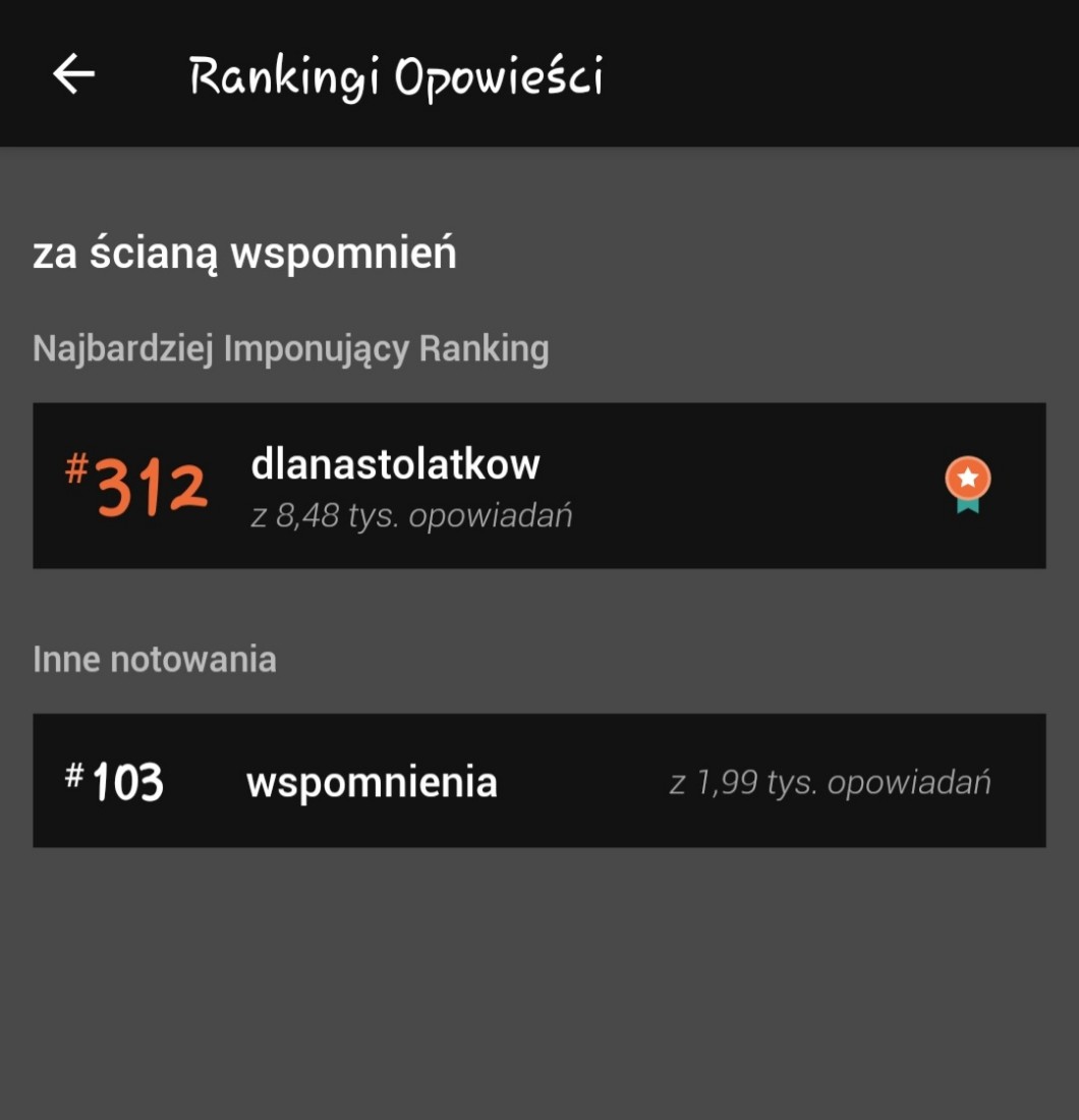 Mam tam 4 prace, jedną z nich troszeczke inspirowałam moim życiem, ale lekko je zmieniłam. Potem wyciągnęłam się w inną moją opowieść, ale ta związana ze wspomnieniami miała więcej wyświetleń I gwiazdek. Za co bardzo dziękuję I oczywiście zapraszam do przeczytania. Na początku tego wpisu wspomniałam, że chciałam się z wami czymś podzielić. Mianowicie moje opowiadanie jest w jakimś tam już rankingu #dlanastolatkow