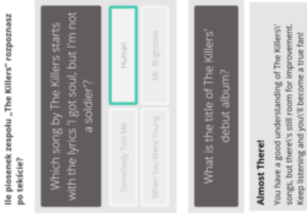 Nie dość że proszę tylko o pytania o tekst a to dalej się o albumy pyta to jeszcze odpowiedzi poprawne nie są. Jakby. Żadna piosenka od The Killers nie zaczyna się od tekstu "Jealousy, turning saints into the sea" a jedyna piosenka która ZAWIERA te słowa nawet w odpowiedziach nie jest. Masakra. Chociaż może ja coś źle robię. Też taka opcja.