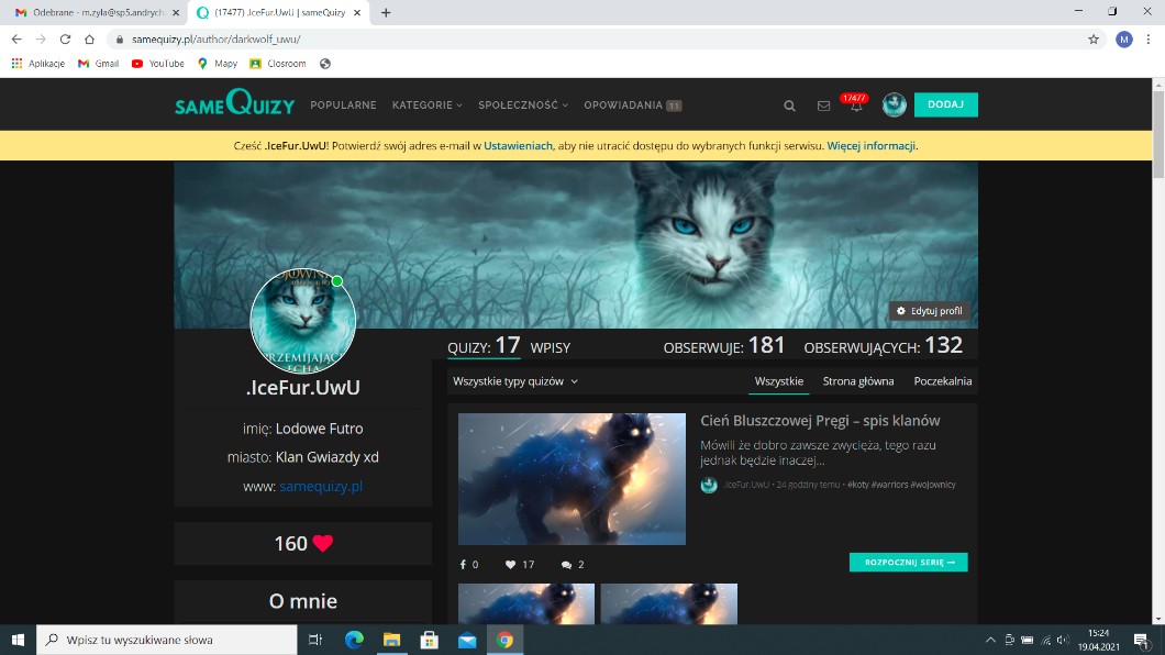 AUTOR•Hej Icefurki, chce powiedzieć tylko 1 rzecz, mam dużo nauki i sprawdzianów więc nie wiem czy się zawiesić czy co. Z całego serca dziękuje i przepraszam @GwiezdzistaBurza , nie będę za często na RP a pewnie sobie myślisz że specjalnie chciałam żebyś wiesz co (nwm czy mogę mówić) żebym mogła się zawieszać, nie ja chciałam żeby ten pasek znikną a tego nie zrobił jak klikłam potwierdź to wszystko było ok, znikną pasek i wszystko było dobrze ale teraz się znów pojawił eh…. Przepraszam was