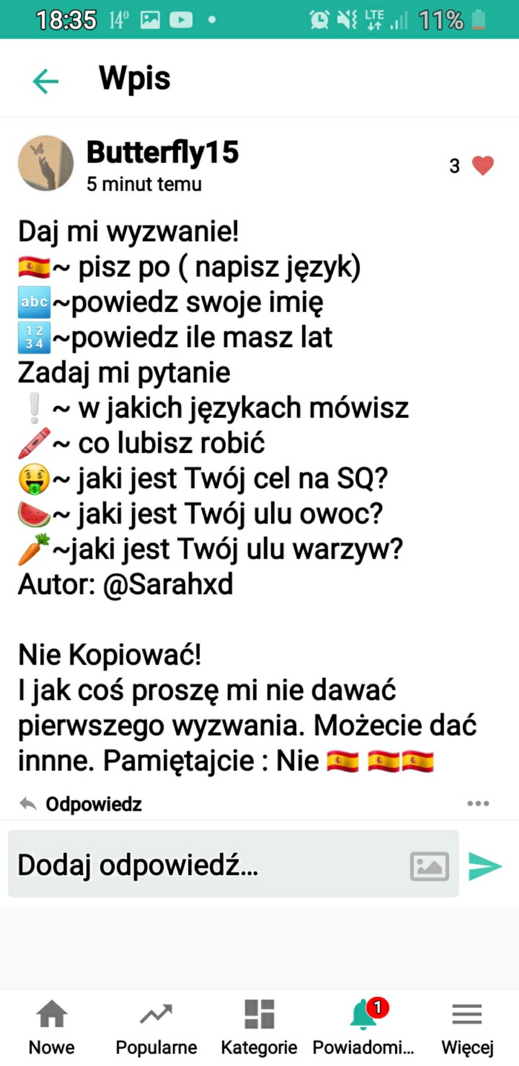 I jak coś proszę mi nie dawać pierwszego wyzwania. Możecie dać innne. Pamiętajcie : Nie 🇪🇸 🇪🇸🇪🇸