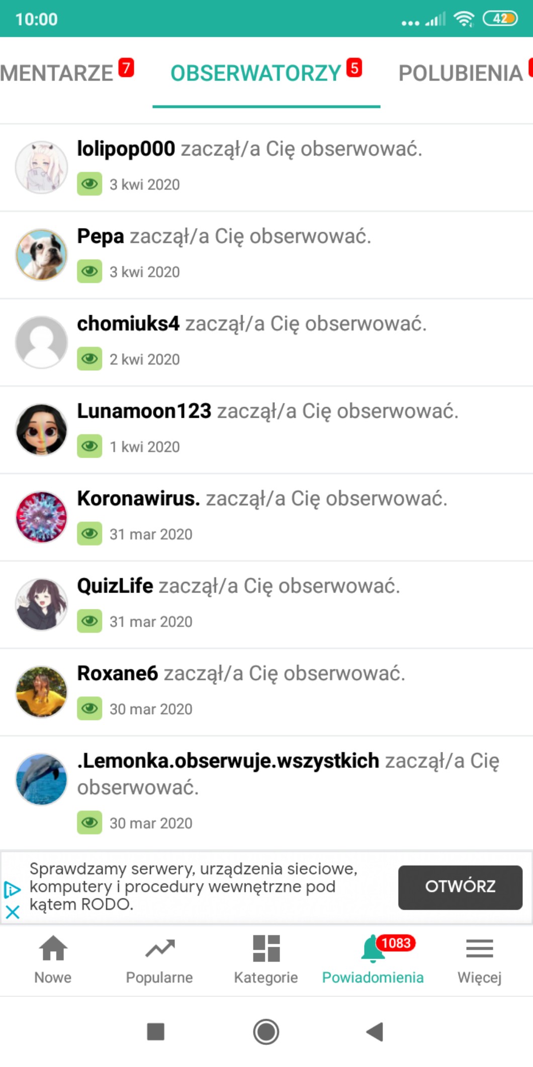 Pierwszą obserwację dostałam od Lemonki, drugą od @Roxane6 , trzecią od @QuizLife, czwartą od @Koronawirus. , piątą od @Lunamoon123 , szóstą od @chomiuks4 , siadma od @Pepa i ósma od naszej @Quiz_Quiz_Quiz ! Jesteście kochani! Spójrzcie na te daty! Tak szybko! To konto zostało założone 26 marca! A pierwsza obserwacja przyszła 30 marca !!!!💜❤️💙❤️💜💙❤️💜