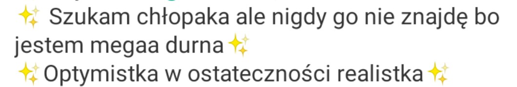 AUTOR•Patrzcie, znalazłam u pewnej osoby na profilu coś takiego. I uważam to za strasznie nielogiczne – na początku mówić, że jest się durnym i wątpić w znalezienie chłopaka, żeby następnie poinformować nas że jest się „optymistą”. Ja jakoś optymizmu w tym nie widzę.