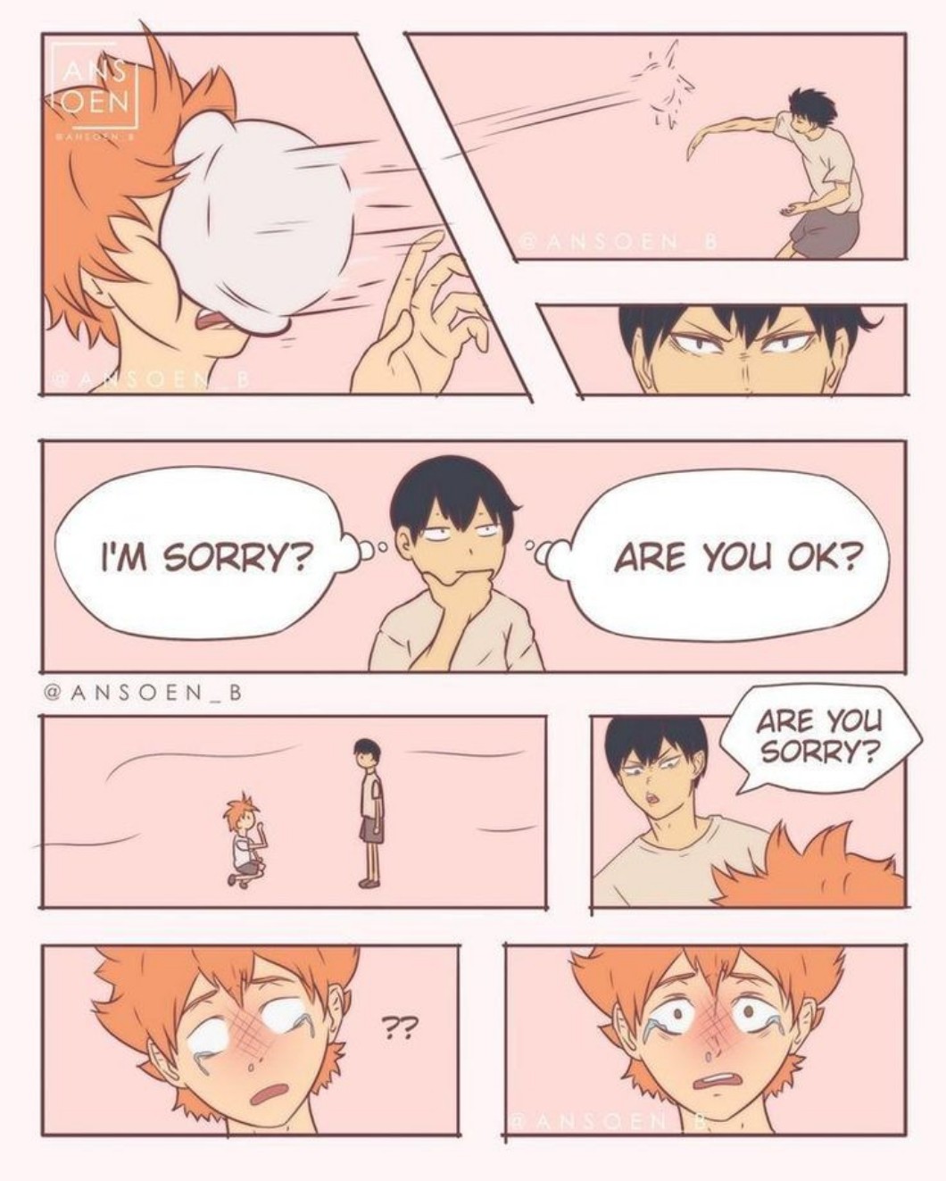 • AUTOR@Misiek1029 Tak miało być ponieważ Kageyama zastanawiał się czy powiedzieć "I am sorry" czy "Are you ok" i je połączył tworząc "Are you sorry" co jest śrdenio poprawne gramatycznie.