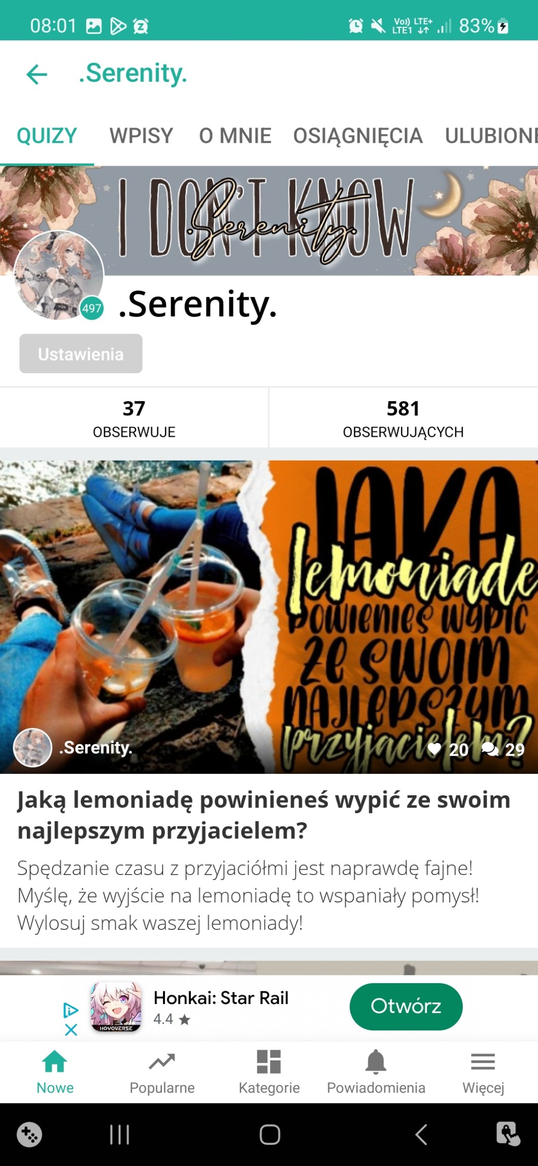 W sumie aż może wstawię coś z tejże okazji, ranking był moim jednym z większych marzeń jak zaczynałam orzygodę na samequizy, a osiągnęłam go w sumie dopiero, gdy po części sobie odpuściłam