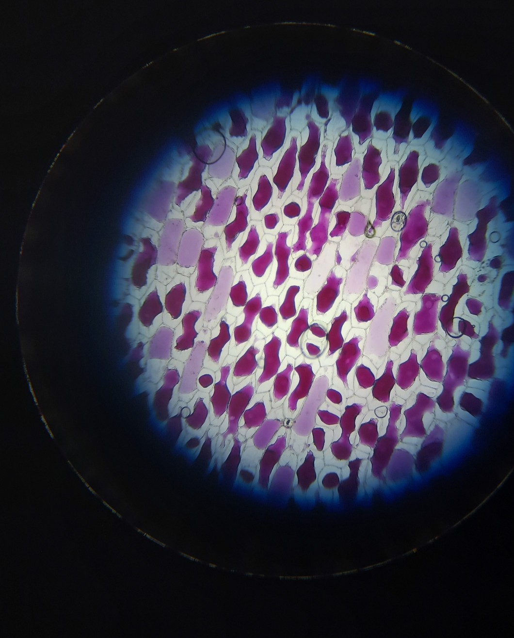 Ciekawostka biologiczna btw. Ostatnio mialam zajęcia mikroskopowe na biologii i poniżej jest zdjęcie plazmolizy komórek roślinnych. Zostały umieszczone w roztworze hipertonicznym, zaszła osmoza i część wody wypłynęła z komórek, a protoplasty (te fioletowe pęcherzyki) odkleiły się od ścian komórkowych (te przezrochyste błonki). Pozdrawiam wszystkie przyszłe i obecne biolchemy :)
