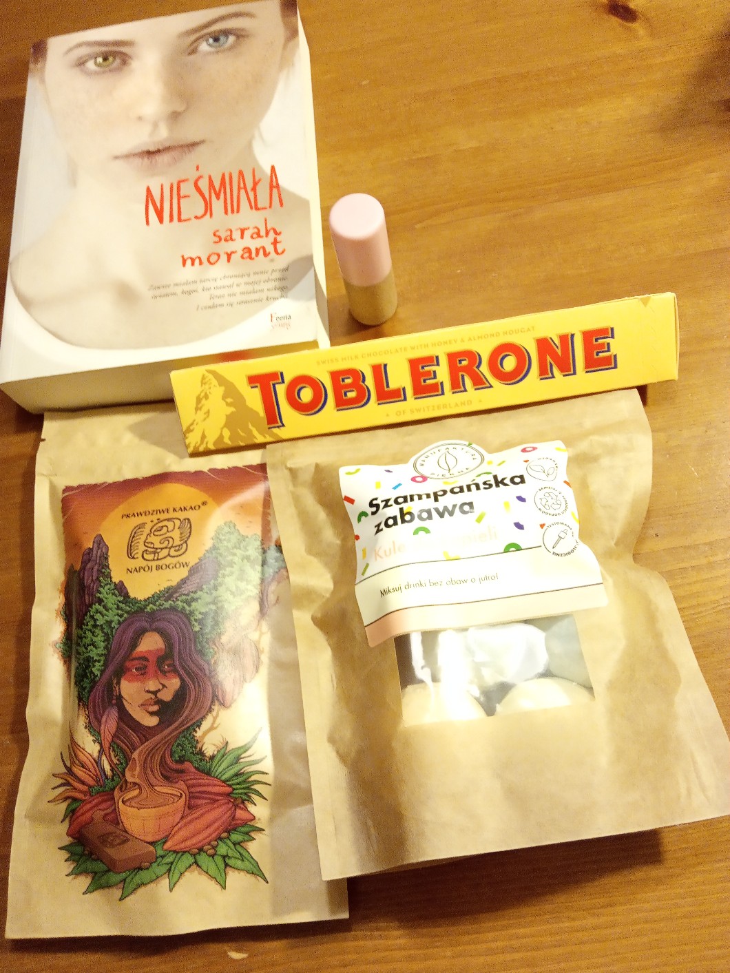 Tak więc od rodziców dostałam książkę (która miała być pod choinkę – będzie na zdjęciu poniżej), kakao, kule do kąpieli, Toblerone i migdałowy balsam do ust, a od dziadków dużego gorzkiego Wedla (bo mówiłam im, że wolałabym nie dostawać słodyczy, bo i tak jem ich trochę za dużo)…