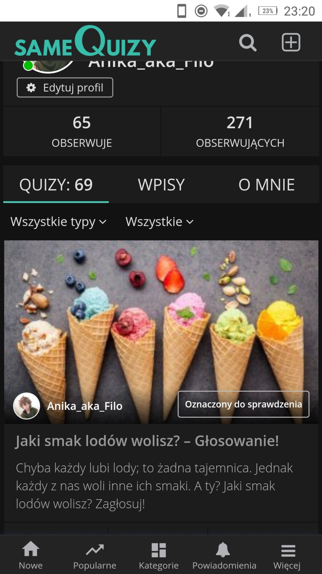 Właśnie wleciał nowy quiz: https://samequizy.pl/jaki-smak-lodow-wolisz-glosowanie/ . Zapraszam do rozwiązywania! I przepraszam za brak godziwej miniaturki, ale komputer mi się zepsuł i nie mogłam zrobić… 😅