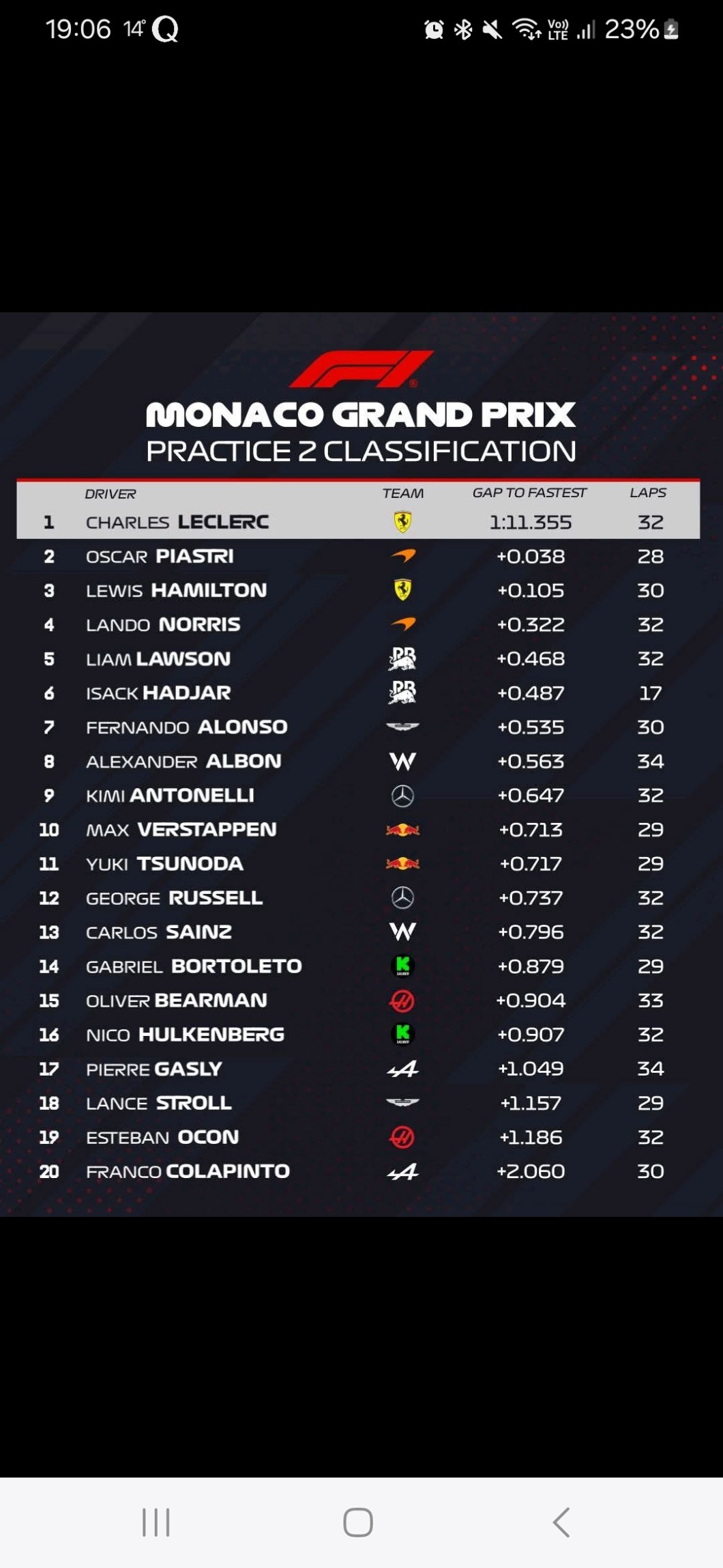 Monakijczyk był szybszy od Maxa Verstappena o 0.1 sekundy, trochę więcej stracił Lando Norris, 0.3 sekundy.