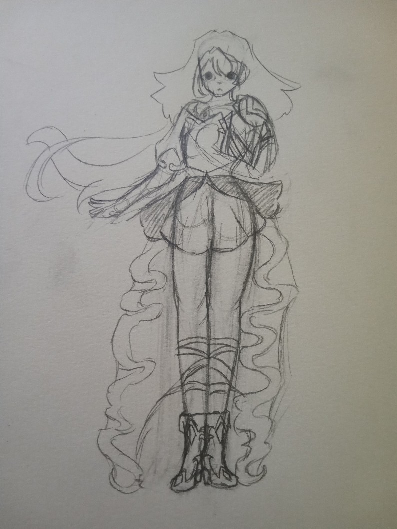 Narysowałam takie coś. To jest projekt kolejnej postaci i jest bardzo wstępny, więc będzie dużo poprawek. Nie przejmujcie się twarzą i tymi krzywymi nogami, zdaję sobie sprawę jak to wygląda, ale chodzi mi głównie o samo ubranie. A co tam u was w ogóle?
