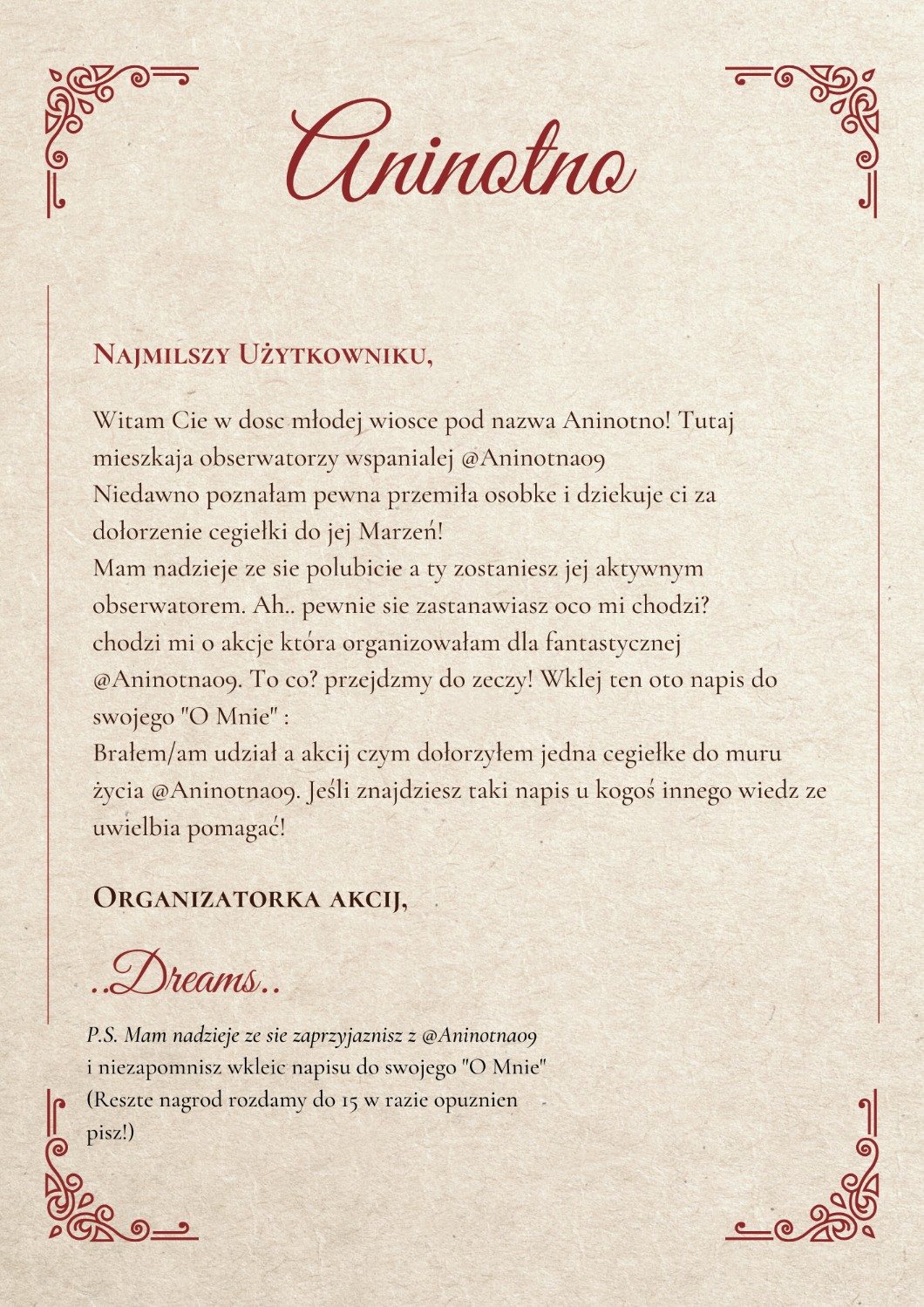 ᴊᴇsʟɪ ᴢᴀᴏʙsᴇʀᴡᴜᴊᴇsᴢ @Aninotna09 , ᴡᴋʟᴇɪsᴢ ᴛᴏ ɴᴀ sᴡᴏᴊ ᴘʀᴏғɪʟ ɪ ɴᴀᴘɪsᴢᴇsᴢ ᴘᴏᴅ ᴏʀɢɪɴᴀʟɴʏᴍ ᴡᴘɪsᴇᴍ ᴜ @..Dreams.. "𝙶𝙾𝚃𝙾𝚆𝙴" ʟᴜʙ "☁︎" ᴛᴏ ᴅᴏsᴛᴀɴɪᴇsᴢ :