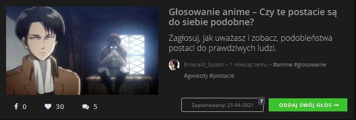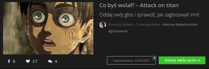 🍒 Zrobili mi nową miniaturkę do quizu z Attack on titan. I wygląda na to, że quiz z ligą złoczyńców też będzie mógł trafić na główną, jest sprawdzony. Tematyka anime jest rzadko spotykana na stronie głównej, ale na szczęście narobiłam sryliard quizów i może będą wybierać powoli (¬‿¬)