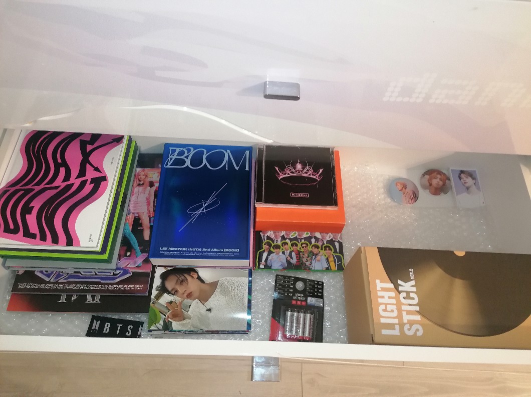 (10 albumów, 3 plakaty, lightstick, masa zdjęć, worek twice, chimmy, 2 przypinki, książka bts, karty Jimina, opaska bts i to chyba tyle) a no i nie pytać się po co tam są baterie (nie chce się tym chwalić więc może niedługo usunę ten wpis)