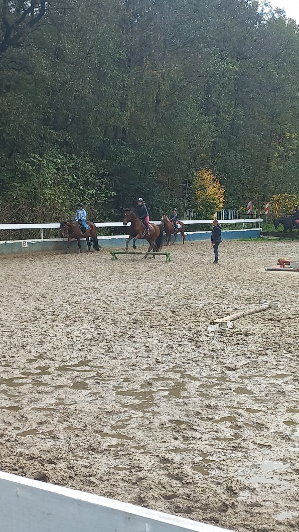Okay, więc nie ma co opisywać stępa, przejdźmy do kłusa. Zakłusował od razu 💦 Trch pojeździłam po ścianie, a potem jechaliśmy na drągi 🐴 Po drągach jechałam koło jakby z drągów, że są 4 drągi na każde ścianie placu, tylko że w środku 😅 (jak ktoś zrozumiał o co mi chodzi to gratuluję 🫡)