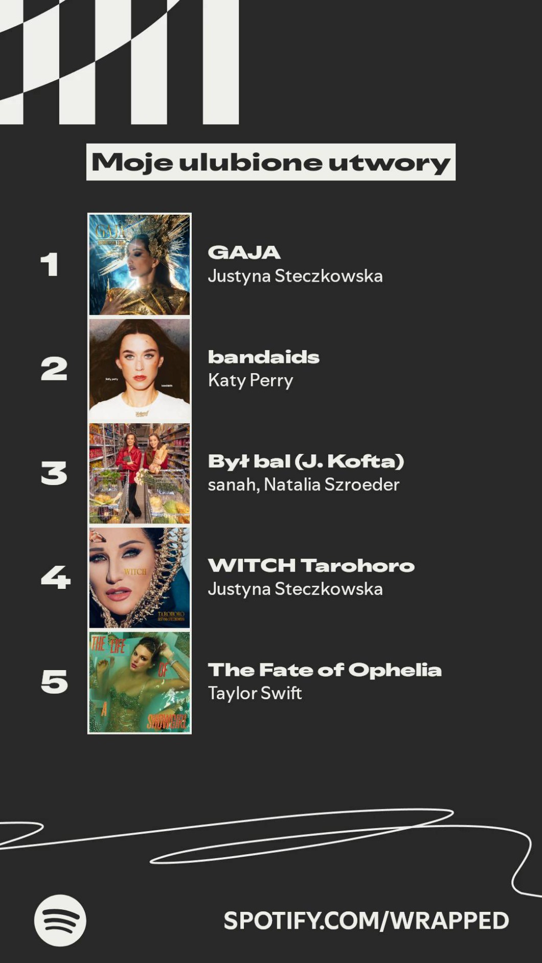 "Bandaids" Katy Perry odsłuchałem 114 razy (utwór wydano 6 listopada, czyli niecały miesiąc temu), "Był Bal (J. Kofta)" Sanah oraz Natalii Szroeder puszczony był u mnie 94 razy, "Witch Tarohoro" Justyny Steczkowskiej słuchałem 63 razy, a "The Fate Of Ophelia" Taylor Swift leciało u mnie 60 razy (ten utwór z kolei wydano równe dwa miesiące temu).