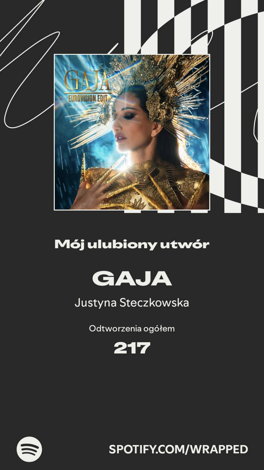 AUTOR•W samym 2025 roku na Spotify przesłuchałem łącznie 6 732 piosenki, a spośród ich wszystkich najpopularniejszą okazał się singiel "Gaja (Eurovision Edit)", którego odsłuchałem 217 razy!