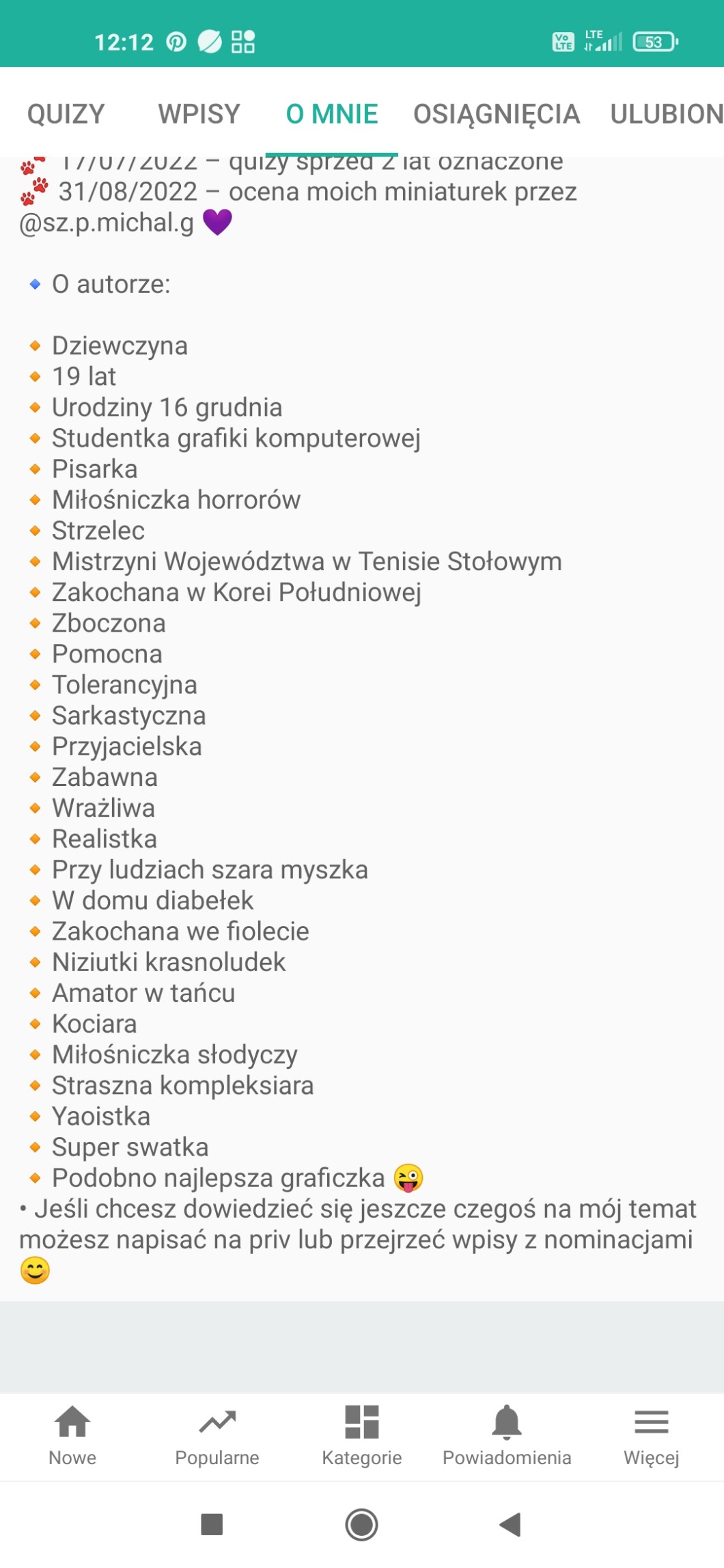 Dziękuję całej społeczności na stronie za WSZYSTKO co mnie spotkało przez te lata 🥰 Wiem, że ostatnio cienko u mnie z aktywnością, ale to konto nadal ma w sobie to coś (widać po wciąż dochodzących obserwacjach, serduszkach, komentarzach i wstawianiu ponownie moich quizów na SG 😜). Dziękuję 😊