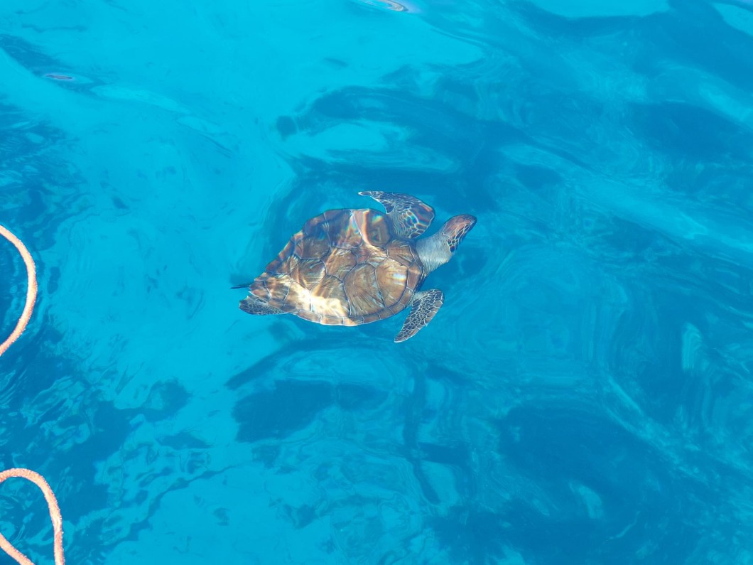 oni z żółwiami w morzu pływają.