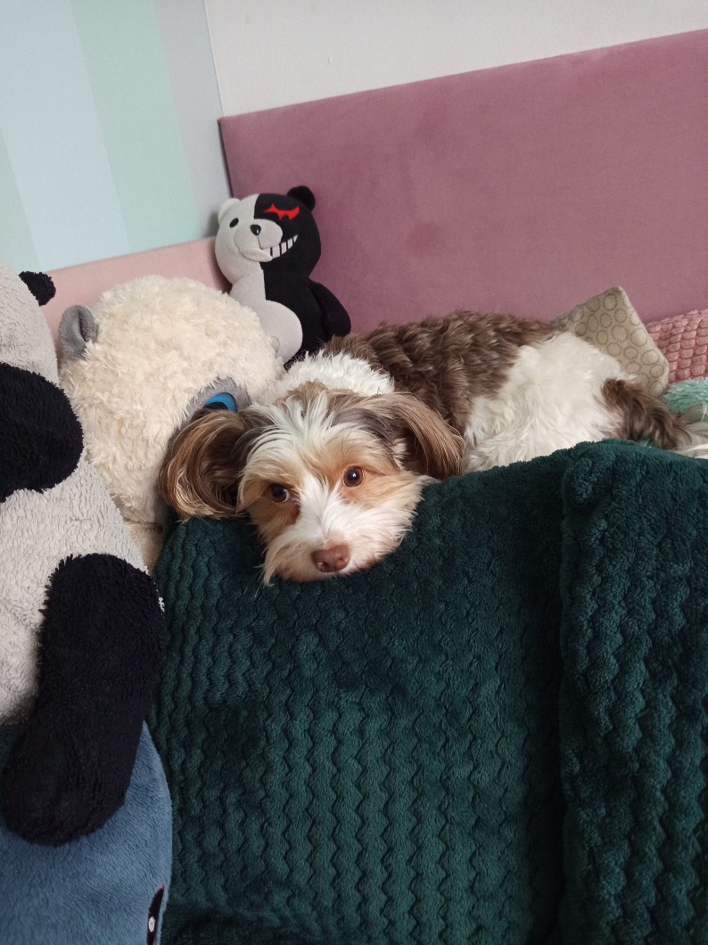 Frytka została umyta i teraz śpi na mnie zawinięta w kocyku niczym zawiniątko jezus