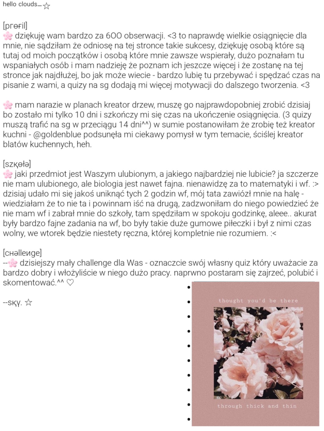 🌸 pisząc teraz ten wpis wpadłam na pomysł kreatoru własnego nieba. dałabym do stworzenia nocne niebo i dzienne, byłoby można wybrać gwiazdy nocą jak i chmury, wygląd słońca i księżyca. myślę że to ciekawy pomysł i mógłby się przyjąć a także – w co wątpie, trafić na sg. dzisiaj może zabiore się za niego i jutro po południu go wstawię. ☆
