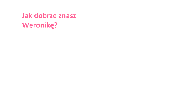 JuliannaSz123 Jak dobrze znasz Weronikę? Jak dobrze ją znasz JuliannaSz123 • 9 lat temu • #kobiety #osobowosc #quiz #samopoczucie #test #zgadywanka #zwierzeta 1 1 Rozpocznij quiz