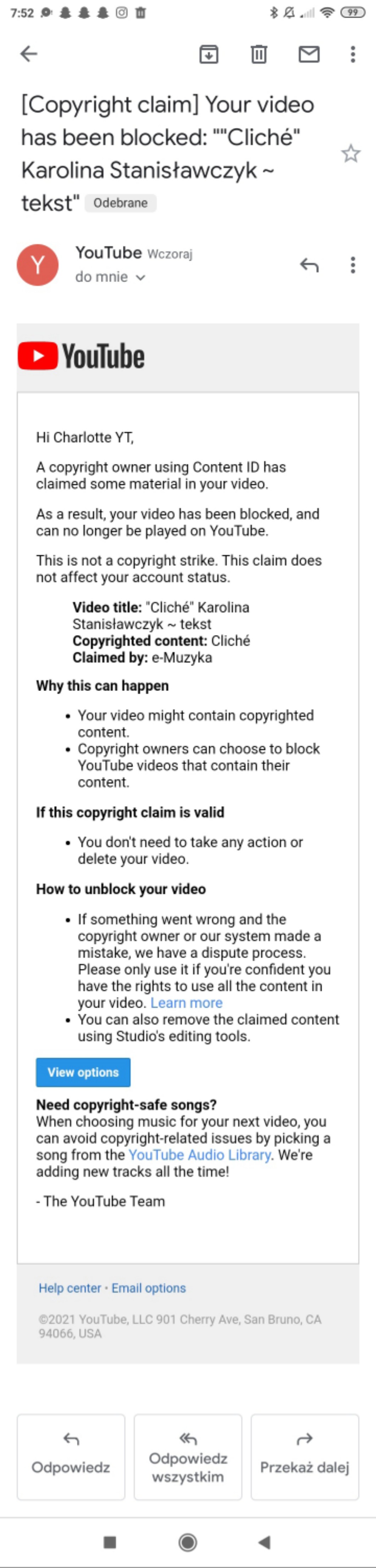 AUTOR•Ej, serio kto mógłby mi podpowiedzieć co mogę zrobić z tym filmem na YT? Trochę boję się zgłaszać błędu żeby nie uznali tego za bezpodstawne. Boję się, że „zepsuję” mój kanał. Miał ktoś taką sytuację? Co zrobiliście? Poniżej zdjęcie maila od YT 👇