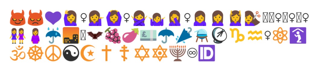 😈👿💜🙋‍♀️💁🙆‍♀️🙅🤷🤦‍♀️🙍🙎💆💇🦹🧜‍♀️🧞‍♀️🧚‍♀️👭🤰☔🌆🦛🦇🍇🍆💷☂️🌂⚗️📡♑♒♀️⚛️🛐🕉️☸️☮️☯️☪️✝️☦️✡️🔯🕎♾️🆔