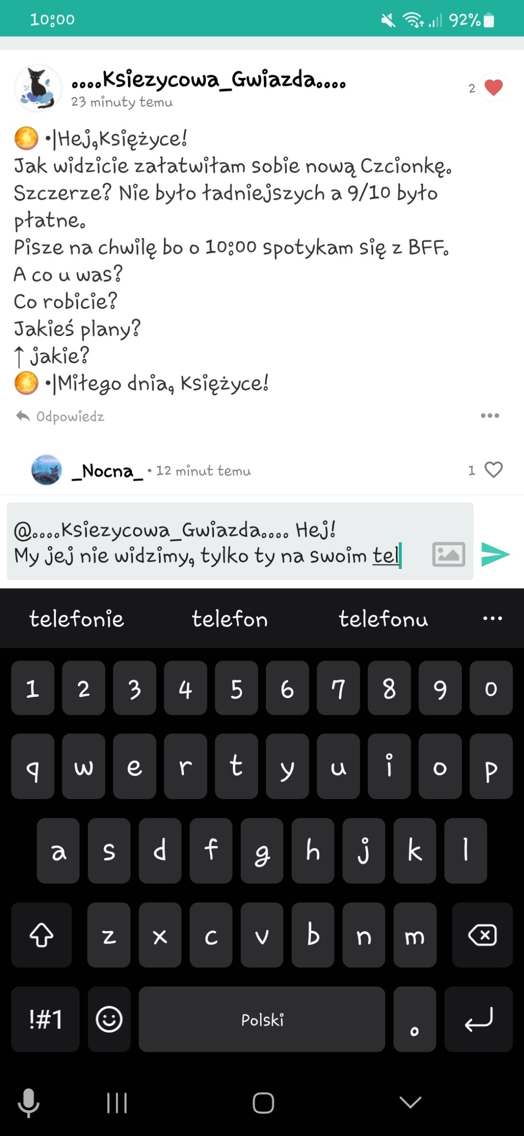 My jej nie widzimy, tylko ty na swoim tel (zdj). Żeby pisać wpisy specjalnymi czcionkami trzeba sobie pobrać klawiaturę