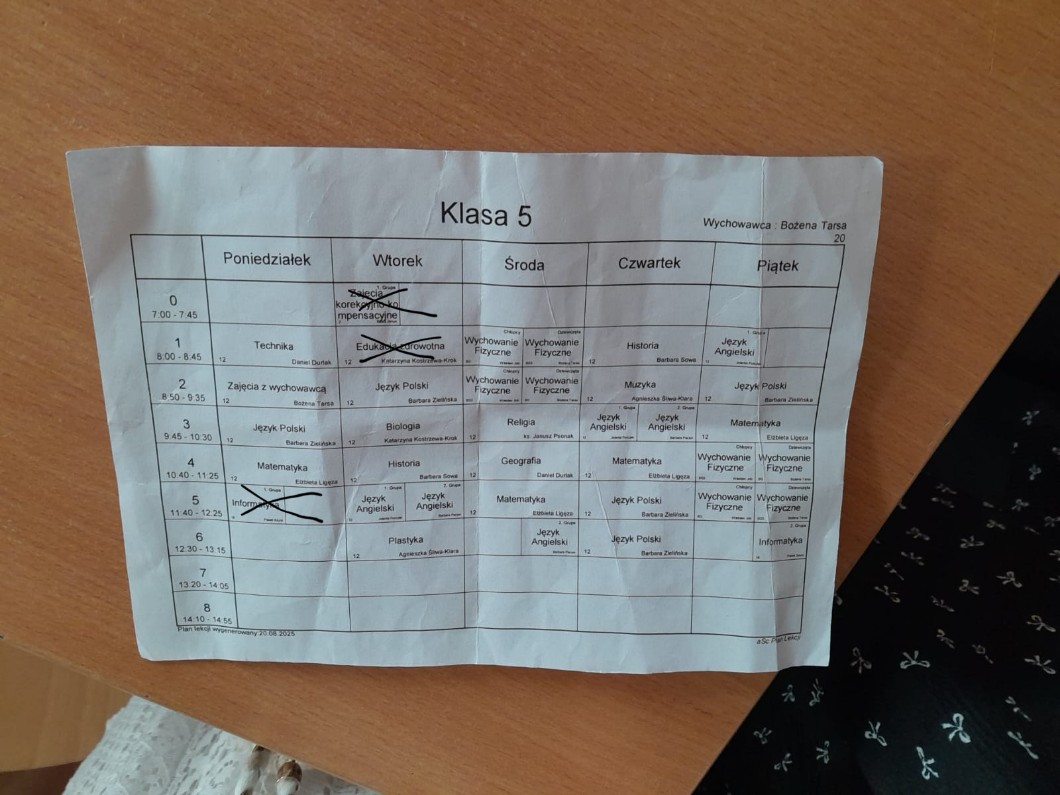 AUTOR•Mój plan lekcji (chodzę do piątej klasy) to co jest wykreślone to to na co nie będę chodzić.