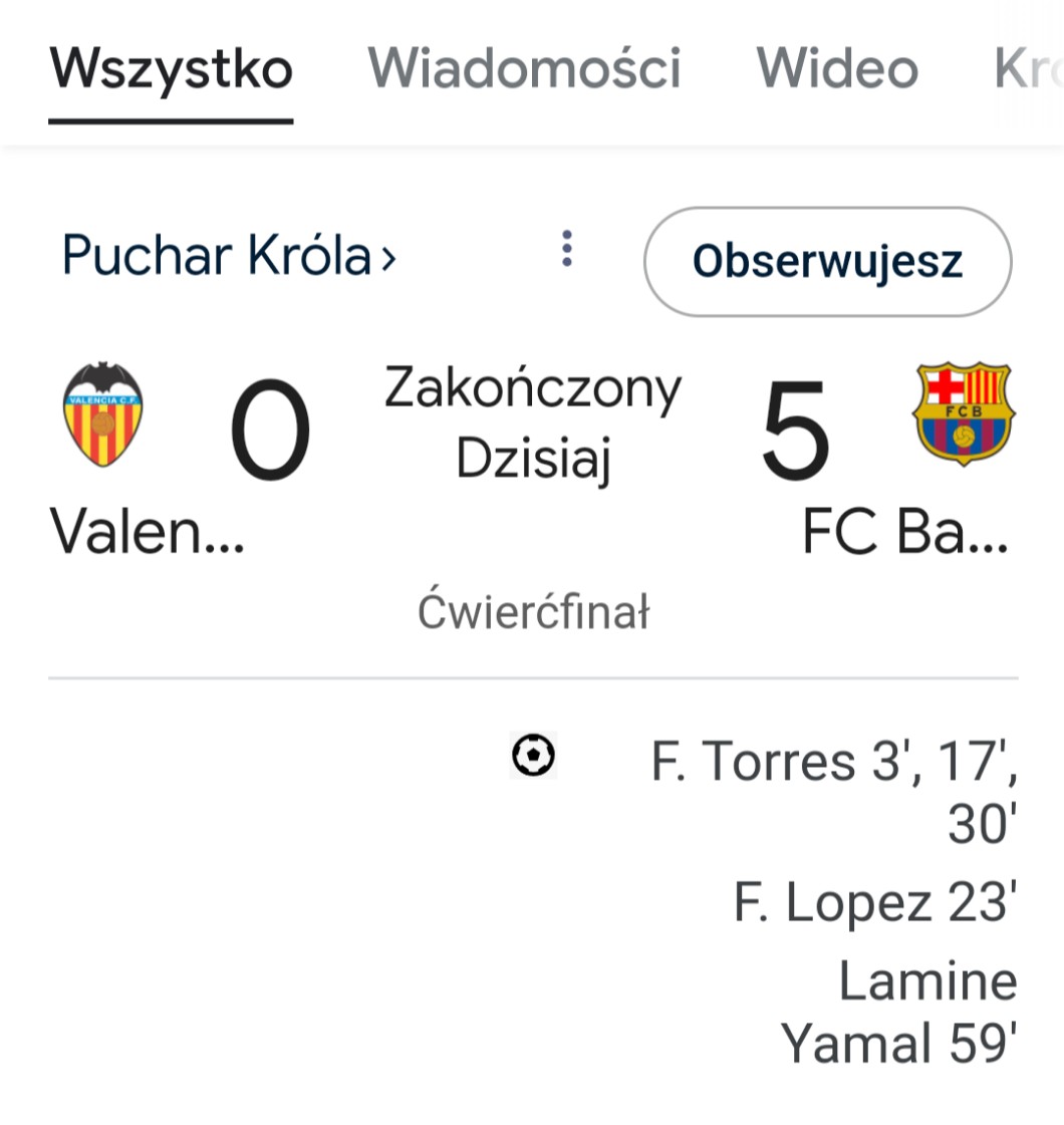AUTOR•Barcelona wygrała z Valencją 5:0 na wyjeździe na meczu ćwierćfinałowym pucharu króla. Hattrick Ferana Toresa. Szczęsny stał na bramce. Robert Lewandowski tym razem nie grł.