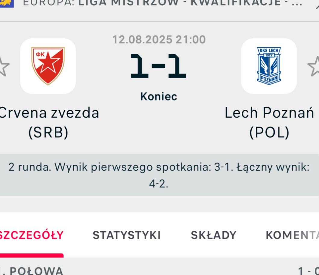 AUTOR•Lech Poznań zremisował z Cwenom Zvezdą ale ponieważ w dwumeczu przegrali nie będą już grali o granie w Lidze mistrzów.