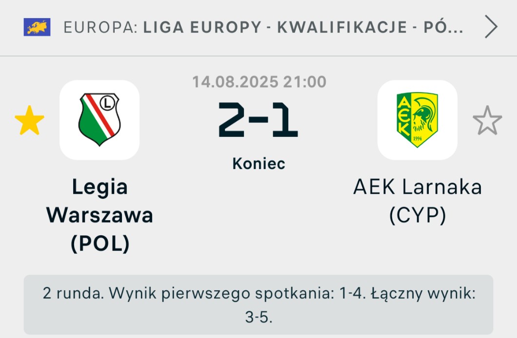 AUTOR•Legia Warszawa wygrała mecz, ale w dwumeczu przegrali, więc będą grać w eliminacjach do ligi Konferencji.