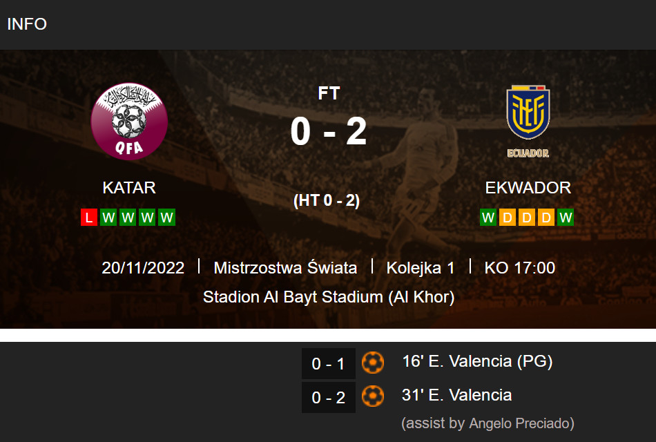Na szczęście Ekwador wygrał a Valencia powinien mieć hat-tricka, gdyż w 3 minucie "niby" był na spalonym, ale tam byli zawodnicy Kataru bliżej bramki od niego, więc gdzie tam był spalony?